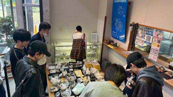 一番盛り上がったのはお土産コーナー!! 柵原鉱山産の黄鉄鉱や蛍光鉱物標本をはじめ、学生たちもストーンアクセサリーを手に入れていました。